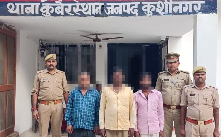 कुशीनगर । पुलिस अधीक्षक कुशीनगर धवल जायसवाल के निर्देशन में वांछित/वारण्टी अभियुक्तों की गिरफ्तारी हेतु चलाये जा रहे अभियान के क्रम में आज दिनांक 10.10.2023 को थाना कुबेरस्थान पुलिस द्वारा मु0अ0सं0 295/2023 धारा 147/323/504/506/354 भादवि0 में वांछित अभियुक्तों 01. लक्ष्मी प्रसाद पुत्र मुनेशर, 02. सुखदेव प्रसाद पुत्र काशी प्रसाद कुशीनगर,03. विनोद पुत्र पूरन निवासीगण ग्राम जंगल पिपरासी मुसहरी पट्टी थाना कुबेरस्थान जनपद कुशीनगर को गिरफ्तार कर अग्रिम आवश्यक विधिक कार्यवाही की जा रही है।